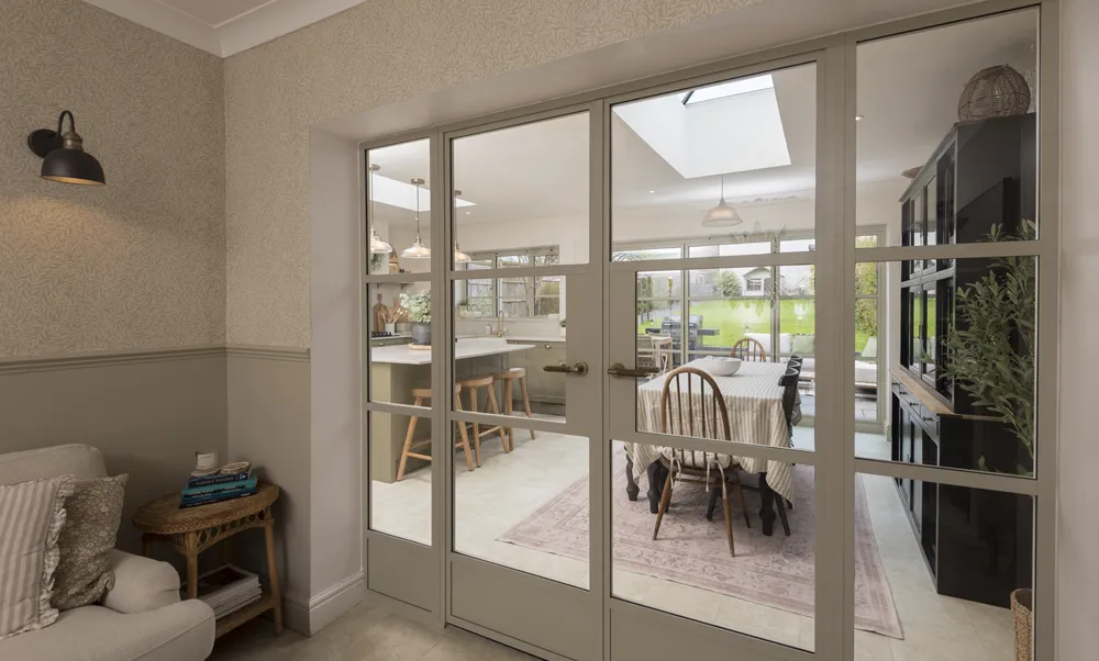 Available as a single door, French pair or corner configuration, the OI-30 is fully bespoke in size, panel layout, colour and finish. With slim interlock sightlines of approximately 30 mm, it maximises glass area for a bright, open feel while providing the durability and smooth operation expected from a premium internal door system.