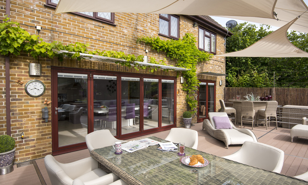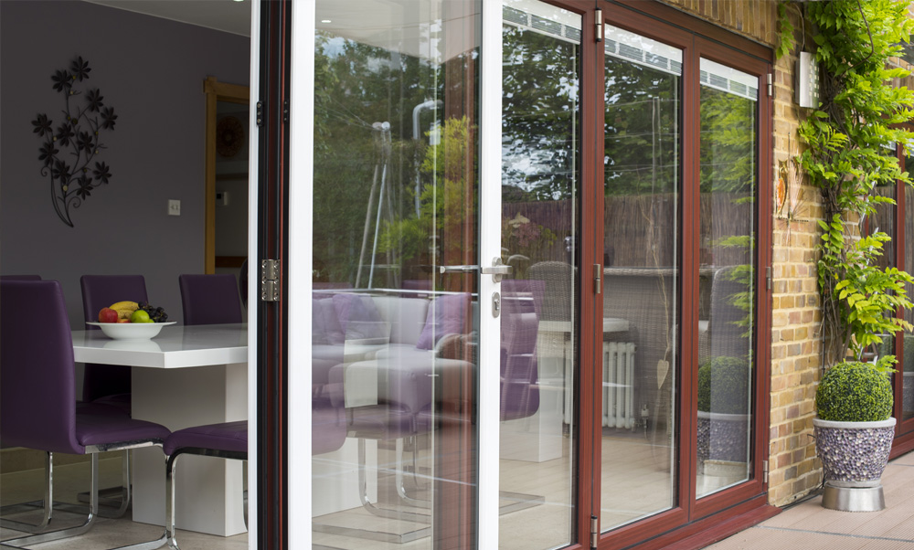 With building work underway, he met with our team and chose two sets of bifolds: a two-door configuration and a five-door opening, both fitted with robust multi-point locking for complete peace of mind. A dual-colour option meant he didn’t have to compromise on style, Hipca White for a clean, bright interior, and Mahogany externally to blend seamlessly with the existing first-floor windows.